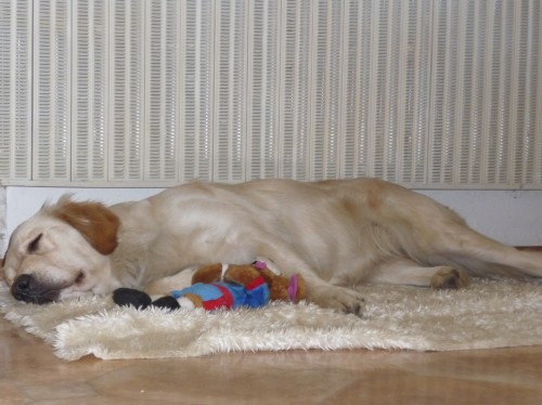 Večer byl opět dnem ,,D". Střelbu na honech nebo tak to zvládám dobře, ale tohle bylo na mě moc. Panička mě dala domů, protože ti blázni pyrotechnici začali střílet snad už kolem 21:00. Já jsem už chytala panickej záchvat a kńučela jako o život. Ani na jídlo jsem neměla chuť. Panička se mnou teda počkala venku, abych se aspoń trochu najedla. Pak mě dala domů a i tam jsem pořád kńourala. Pak mě panička uklidňovala a až jsem byla v celku klidná, tak jsem si šla lehnout. Chvilku jsem si hrála s pískacím plyšákem. Panička se divala na telku a já jí spala pod nohama -kdyby náhodou... Pak mě šla panička vyvenčit, abych se doma nepočůrala.Tak jsme šly. Bylo to už celkem v pohodě a tak mě panička nechala aspoň chvilku venku. Jenže pak asi v 23.30 začala střelba ještě větší. Panička pro mě zas letěla, aby mi nedej bože ještě z toho hráblo. Doma jsem byla už OK Radši se ani neodvažovala ode mě odejít a na ohňostroj se divala z okna. Tím mi moc nepomohla. Já jsem furt za ní i k tomu oknu lezla a chtěla jsem se dívat s ní. Ale přitom mě to tak strašně dunělo v uších. Pak jsem odběhla a strachy jsem se doma vyčůrala. Za to se paničce omlouvám.Ona to ale pochopila a v klidu to ulidila. Pak mě radši nechala už celou noc doma, protože někteří chytráci stříleli i ve 3 ráno! Pustila mě i do postele a tam mi bylo nejlíp, protože jsem byla hodně blízko paničky a nic mi nehrozilo.